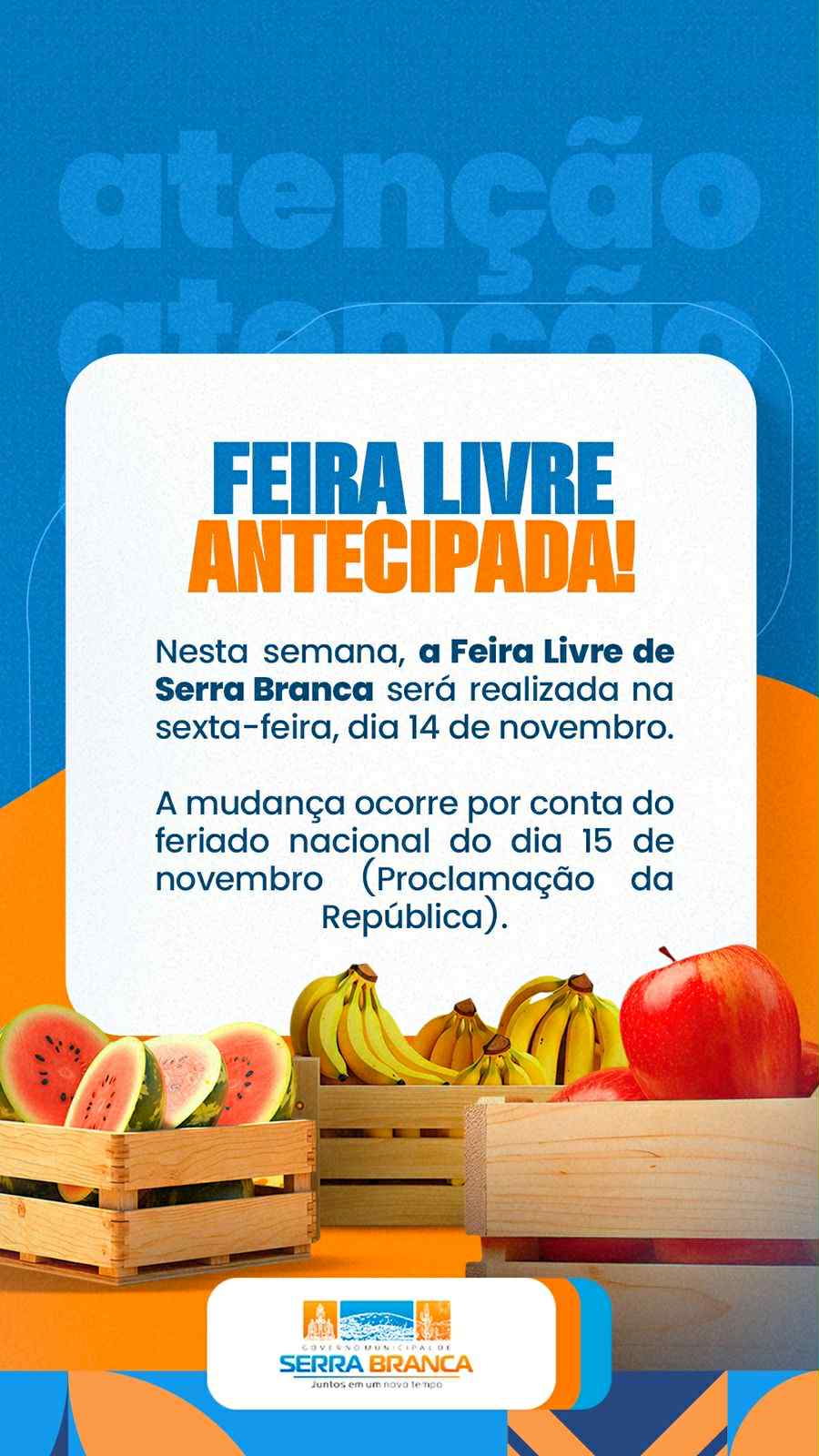 A Prefeitura Municipal de Serra Branca informa que, excepcionalmente nesta semana, a Feira Livre Municipal será antecipada para a sexta-feira, dia 14 de novembro, em virtude do feriado nacional da Proclamação da República, comemorado no sábado, dia 15 de novembro. A mudança foi estabelecida por meio do Decreto Municipal Nº 26/2025, que regulamenta o funcionamento […]