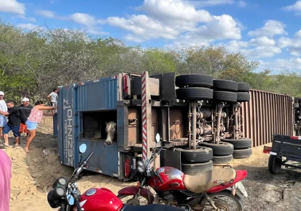 Carreta com mais de 80 bois tomba em rodovia do Sertão e deixa animais mortos e feridos