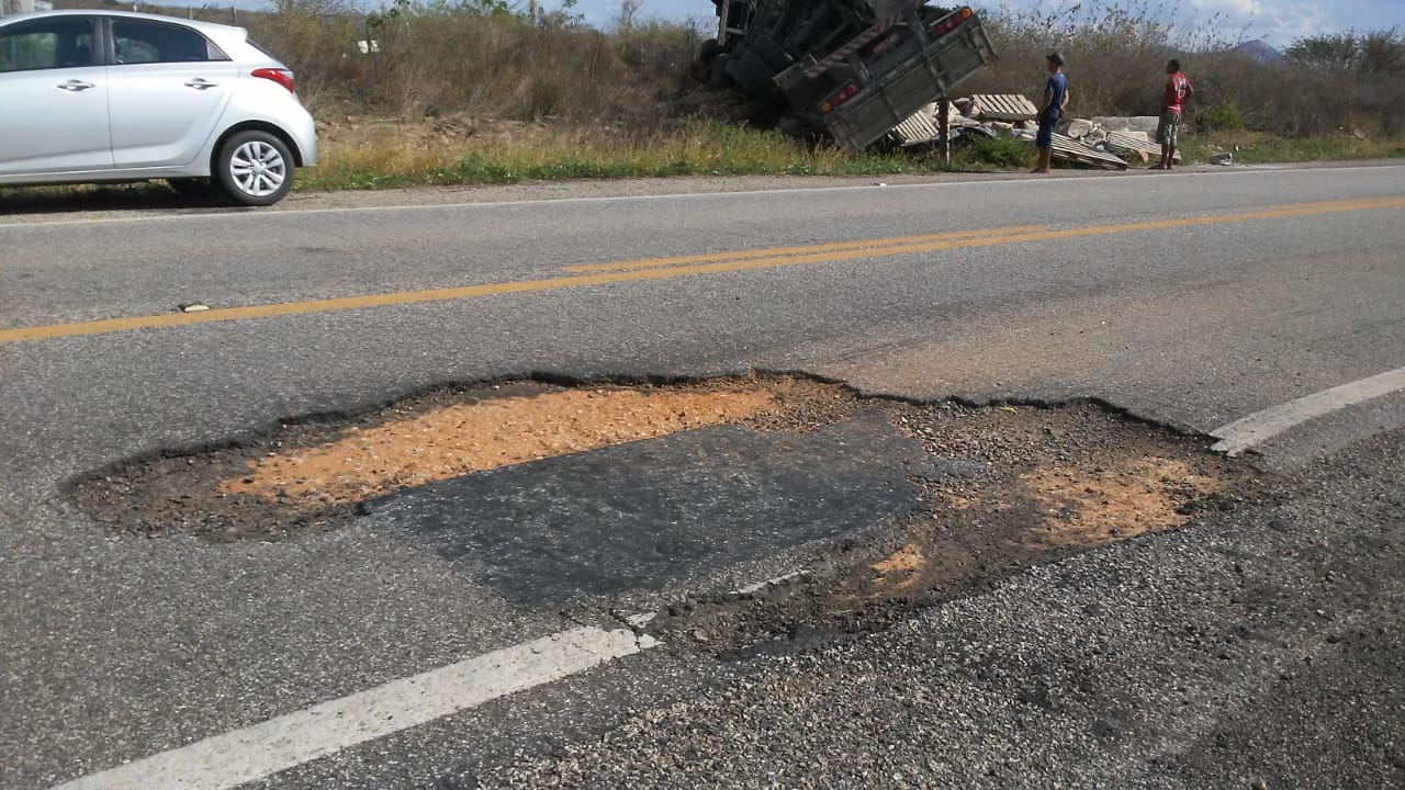 Buracos na BR 412 podem ter feito carreta tombar na altura do município de Serra Branca