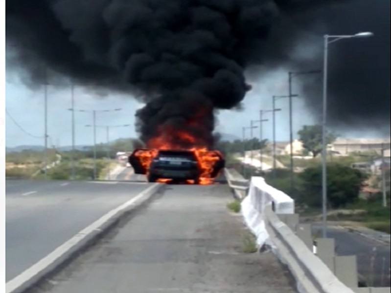 Carro de serrabranquense pega fogo em cima de viaduto, em Campina Grande