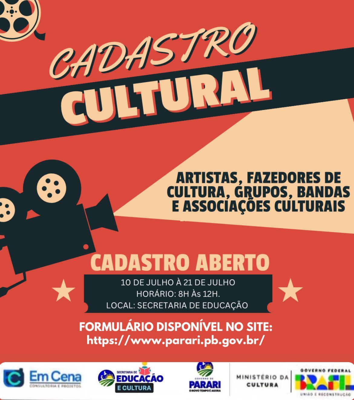 A Prefeitura Municipal de Parari através da Secretaria de Educação e Cultura anuncia lançamento de Cadastros para Artistas, Fazedores de Cultura, Grupos, Bandas e Associações Culturais. Os Formulários estarão disponíveis no site da Prefeitura e presencialmente na Secretaria de Educação e Cultura. Entre outros objetivos, o cadastro servirá de base para as ações municipais no […]