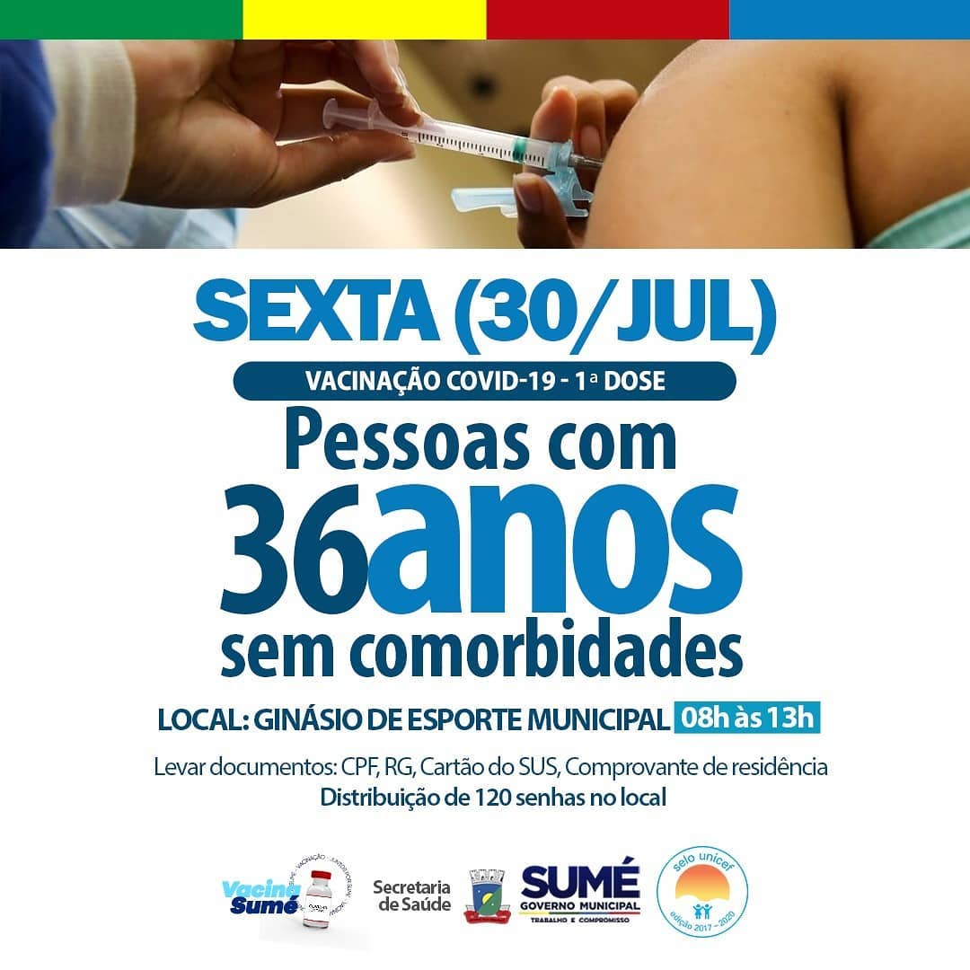 Nesta sexta-feira (30), a equipe de vacinação de Sumé estará imunizando o público de 36 anos de idade, sem comorbidades. A vacinação acontecerá no ginásio de esportes municipal das 08h às 13h com distribuição de 120 senhas no próprio local da vacinação. É importante levar os seguintes documentos: CPF, RG, comprovante de residência e […]