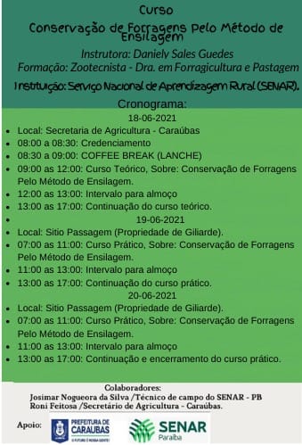 A Secretaria da Agricultura do município de Caraúbas em parceria com o SENAR – Serviço Nacional de Aprendizagem Rural estarão realizando nos dias 18, 19 e 20 de junho do corrente, o curso de conservação de forragens pelo método de ensilagem para os agricultores familiares e criadores de caprinos e ovinos. O curso será ministrado […]