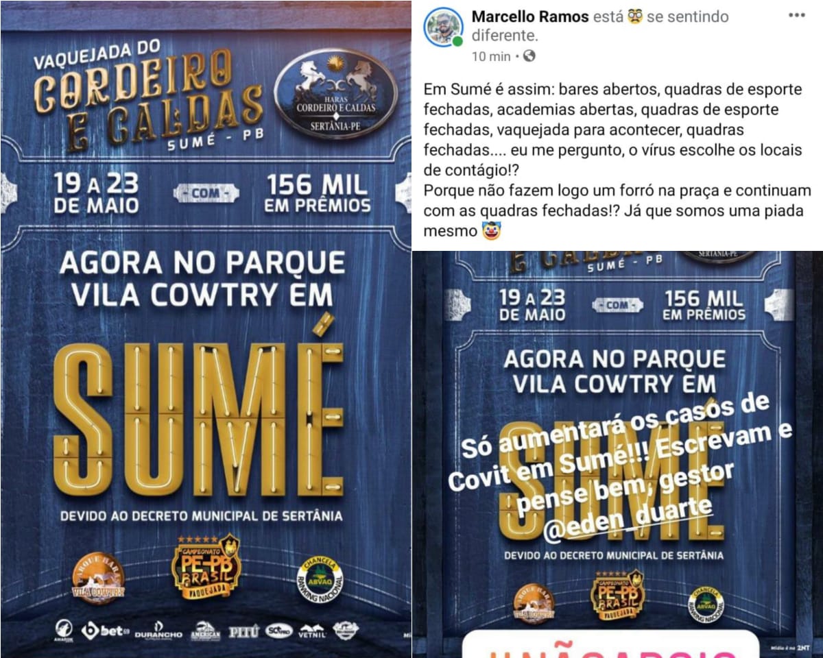 Uma vaquejada que ocorreria no Parque Cordeiro e Caldas, na cidade de Sertânia, foi transferida para o Parque Vila Cowtry, na cidade de Sumé, no Cariri Paraibano. O anúncio causou alvoroço e revolta em parte da população sumeense, que ver o aumento de internações por causa da Covid-19 em toda a região e sabe da […]