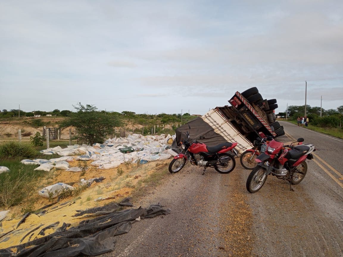 Carreta carregada com milho e torta tomba na PB 148; ocupantes eram de Taperoá