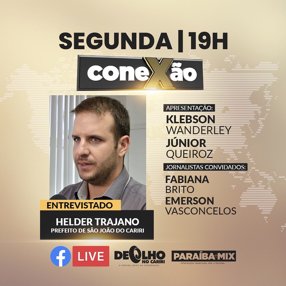 Já consolidado como sucesso de audiência, o programa de entrevistas ‘CONEXÃO’ idealizado pelos portais de notícias De Olho no Cariri e Paraíba Mix receberá nesta segunda-feira, 24 de agosto, o prefeito e pré-candidato à reeleição do município de São João do Cariri, o jovem Hélder Trajano (DEM). O gestor sãojoãoense estará sendo sabatinado pelos jornalistas […]