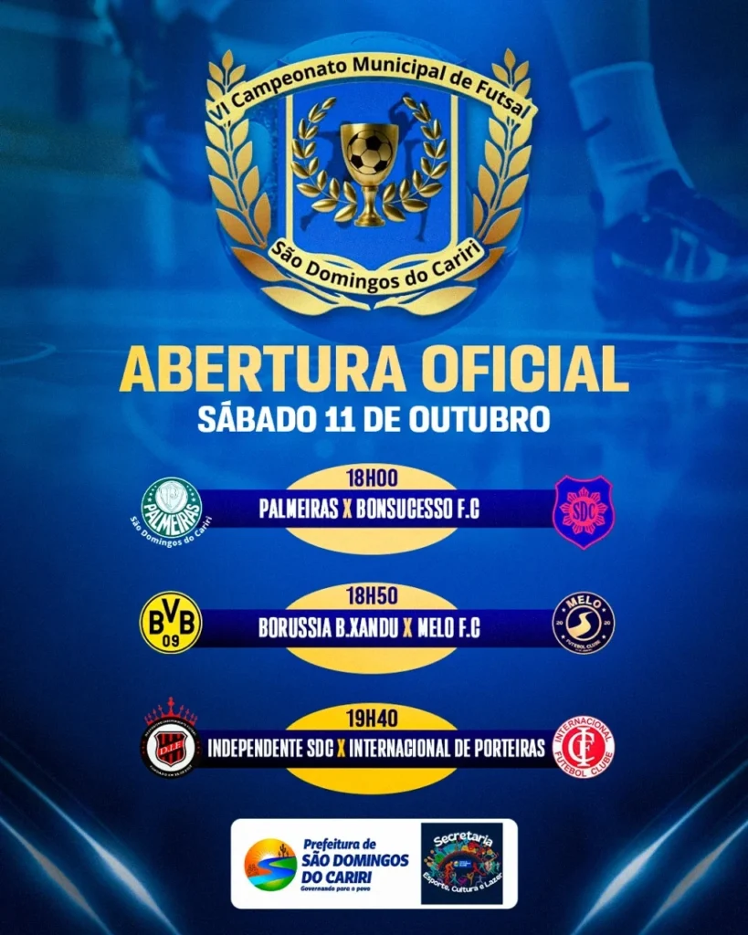 A bola vai rolar neste sábado (11), marcando a abertura oficial da VI edição do Campeonato Municipal de Futsal de São Domingos do Cariri. O evento esportivo promete agitar as noites de sábado e reunir atletas, torcedores e amantes do futsal em uma grande celebração do esporte local.
