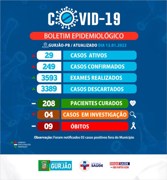 Dentre o intervalo de 48 horas, o município passou de 10 para 29 casos ativos da doença, praticamente triplicando o número de casos. No novo boletim divulgado nesta quinta, ainda foi registrado que 04 pacientes se encontram sob investigação e seguem monitorados pela saúde do município de Gurjão. Ainda de acordo com o novo boletim, foram notificados ainda 03 casos positivos fora do município.