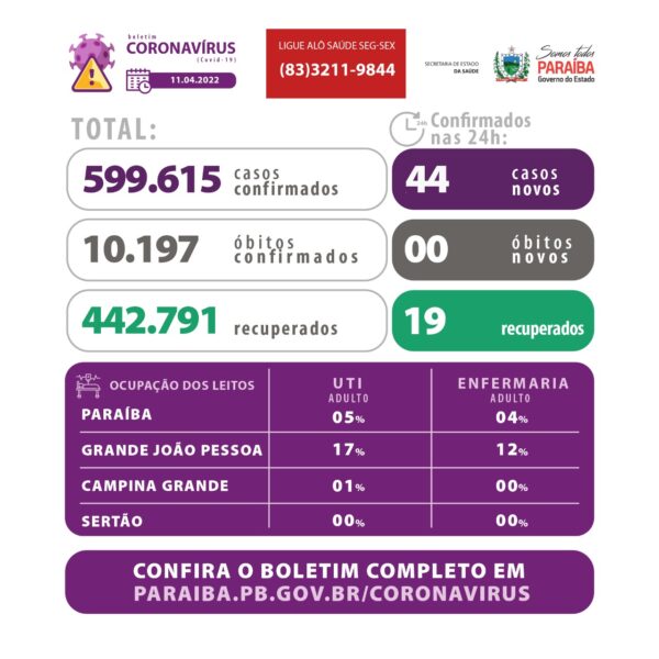 A Secretaria de Estado da Saúde (SES) registrou, nesta segunda (11), 44 casos de Covid-19, todos leves. Agora, a Paraíba totaliza 599.615 casos confirmados da doença, que estão distribuídos por todos os 223 municípios. Até o momento, já foram realizados 1.503.305 testes para diagnóstico da Covid-19.