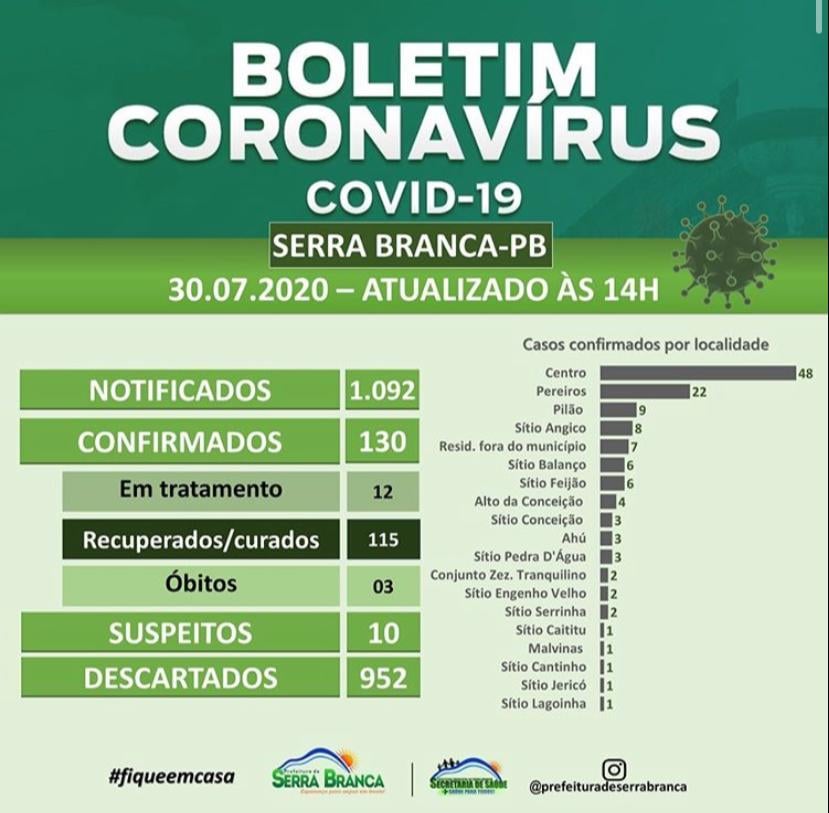 Nos últimos dias, Serra Branca também vem registrando um alto índice de pacientes recuperados da doença, chegando a 115 pacientes curados entre os 130 casos confirmados do novo vírus, chegando ao índice de 90% de casos de cura.