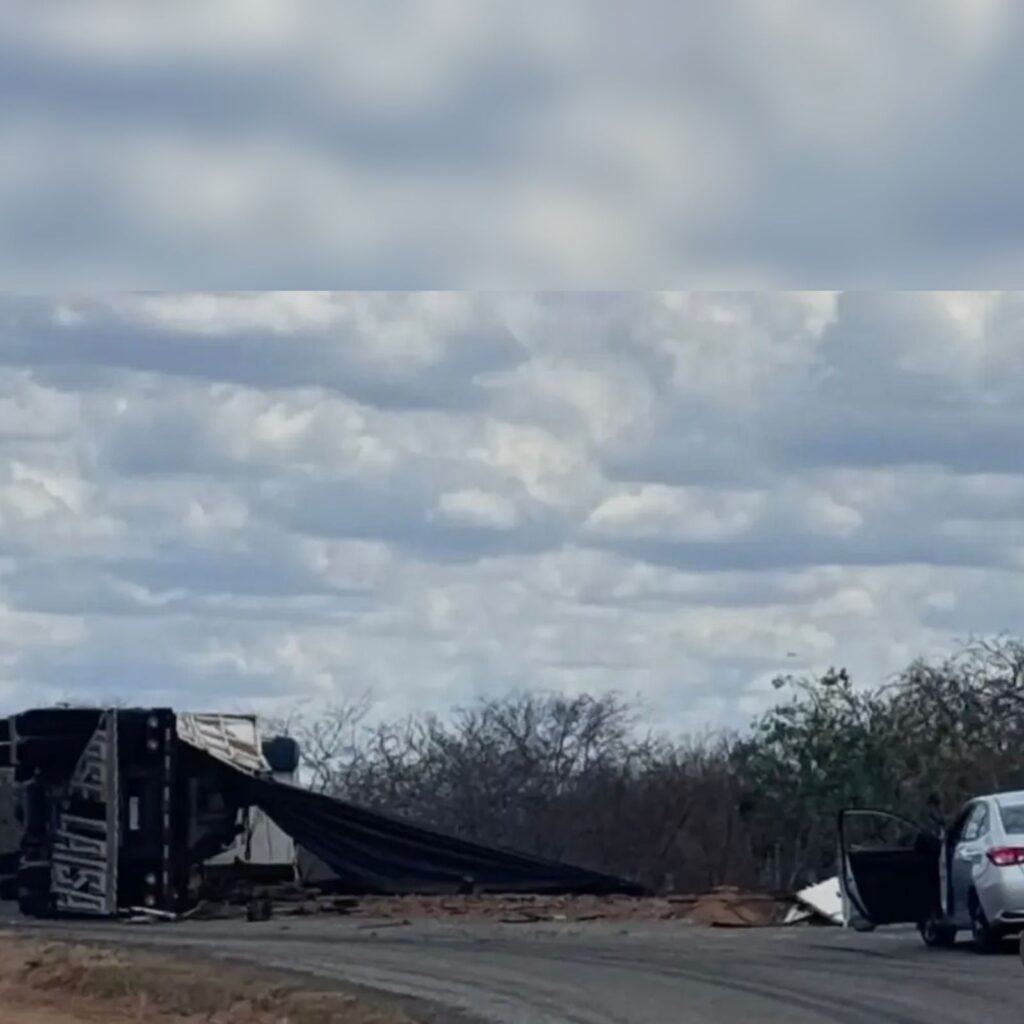 Uma carreta tombou na tarde desta quarta-feira (14) na rodovia estadual PB-200, no trecho que interliga os municípios de Serra Branca e Parari, no Cariri paraibano.