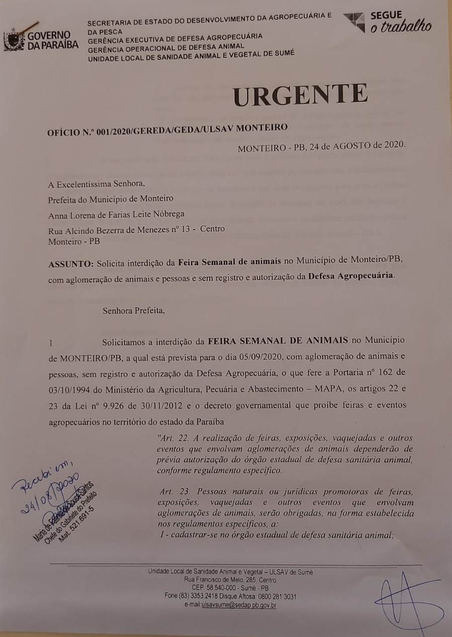 Confira abaixo o ofício que determinou a suspensão da volta da Feira de Gado de Monteiro.