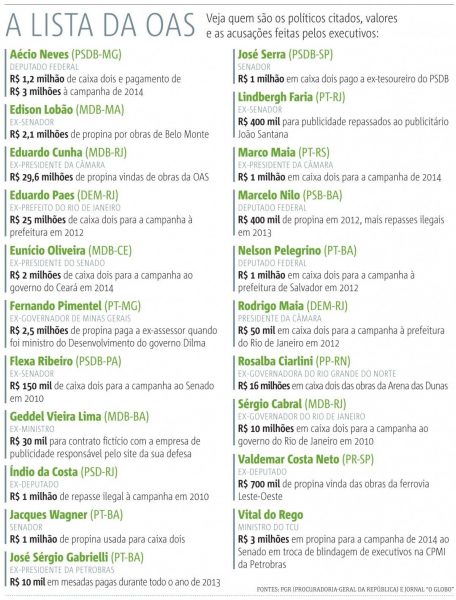 A lista da OAS inclui nomes de políticos do PSDB, MDB, DEM, PT, PSD, PSB e PP, mas envolve também empresários, doleiros e ocupantes de altos cargos de estatais.