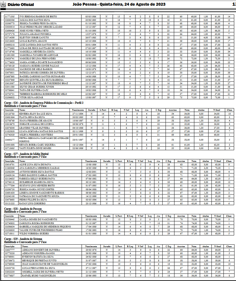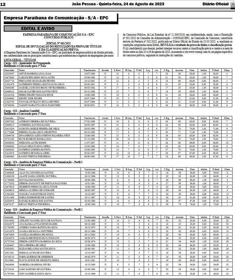 Foi publicado na edição desta quinta-feira (24) do Diário Oficial do Estado (DOE) o resultado da prova de títulos para 12 cargos do concurso da Empresa Paraibana de Comunicação (EPC). No mesmo edital também consta a classificação prévia para tais cargos. O certame foi realizado em abril pela empresa Vunesp.