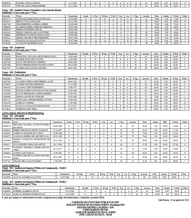 Também constam os resultados da prova de títulos e classificação prévia da chamada ‘lista geral prático-profissional’ para o cargo de advogado e da ‘lista especial’ para o cargo de analista de empresa pública de comunicação (perfis 1 e 2).