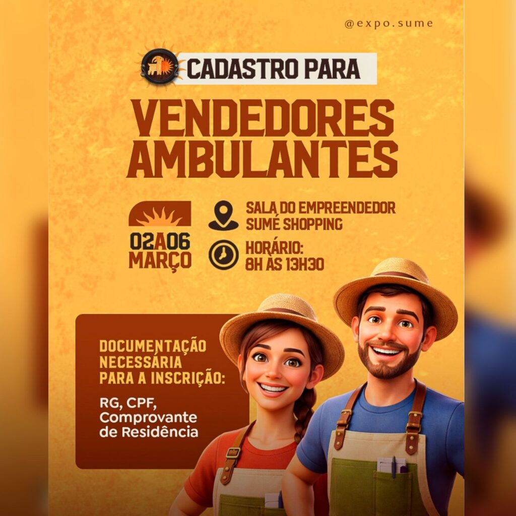 Estão abertas as inscrições para cadastro dos vendedores ambulantes que desejam comercializar alimentos na III Edição da Expo Sumé, um dos eventos mais aguardados do calendário municipal, que promete movimentar a economia e fortalecer o empreendedorismo local.