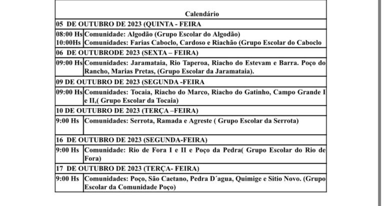 Calendário de Inscrições por comunidades rurais: