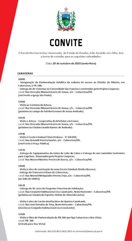 A agenda do governador terá início pela manhã e decorrerá até a tarde, onde contará com a inauguração da rodovia PB-148, que liga o distrito da Ribeira ao município de Cabaceiras, e visitará obras em execução.