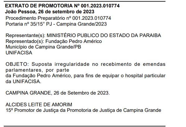 De acordo com o extrato do procedimento, a Fundação Pedro Américo está sendo investigada por supostamente ter recebido emendas parlamentares para equipar o hospital particular da Unifacisa.