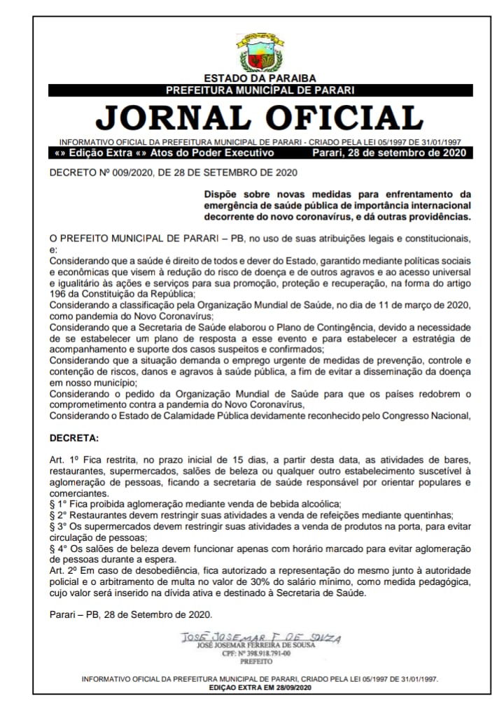 A prefeitura de Parari emitiu nesta segunda-feira um novo decreto ao município em razão do aumento de casos de coronavírus.