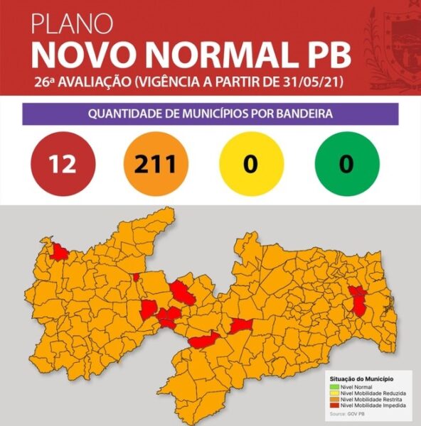 A 26ª avaliação mostra que 100% dos municípios paraibanos encontram-se nas bandeiras vermelha e laranja, com um expressivo crescimento de municípios classificados em laranja. Pela segunda vez ao longo de todo ciclo de avaliações não há municípios em bandeira amarela na Paraíba, a primeira vez foi na 22ª avaliação, no mês de abril. A Nota técnica com as informações, bem como as classificações de cada município e protocolos sanitários a serem adotados estão disponíveis no site: https://paraiba.pb.gov.br/dire…