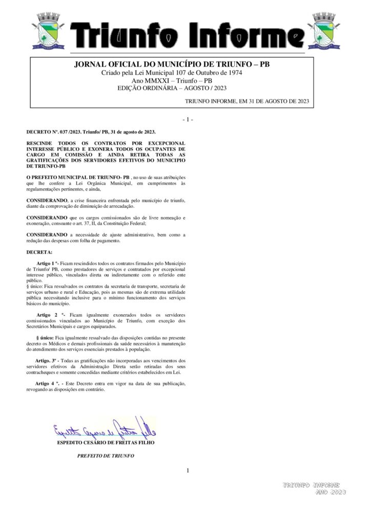 O prefeito de Triunfo, no Sertão paraibano, Espedito Cesário de Freitas Filho, demitiu todos os servidores comissionados e contratados para conter os gastos da administração pública. O gestor lançou um decreto informando que as medidas estão sendo tomadas por conta da crise financeira enfrentada por conta da diminuição de arrecadação.