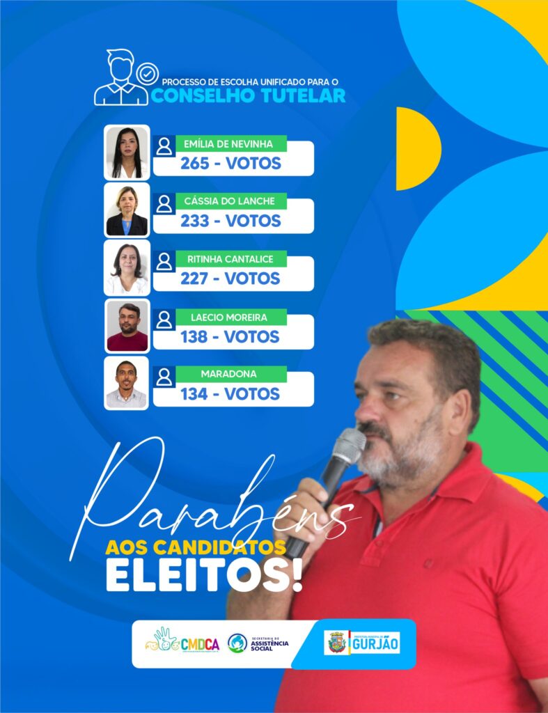 Os eleitos para o Conselho Tutelar de Gurjão são: Emília de Nevinha, Cássia do Lanche, Ritinha Cantalice, Laecio Moreira e Maradona. Como suplentes ficaram Adayla Lemos e Vanusa. O prefeito Zé Elias expressou sua confiança de que essa equipe está verdadeiramente comprometida com a importante missão que lhes foi conferida pelo voto popular. “Nosso sincero desejo é que possamos agregar nossas forças em prol do nosso amado município e de seus habitantes, em especial nossas crianças e adolescentes”, enfatiza Zé Elias.