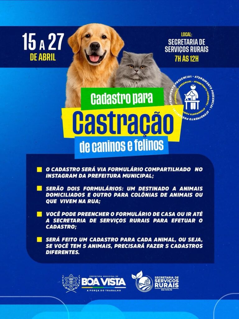 A Prefeitura Municipal de Boa Vista, por meio da Secretaria Municipal de Serviços Rurais, inicia a partir desta quarta-feira (15) o cadastro para o programa de castração de animais domésticos e em situação de rua no município. A ação tem como objetivo promover o controle populacional de cães e gatos, além de contribuir diretamente para a saúde pública e o bem-estar animal.