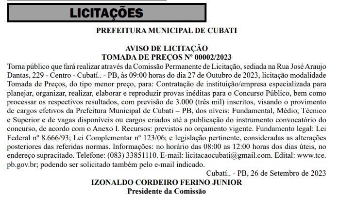 “Contratação de instituição/empresa especializada para planejar, organizar, realizar, elaborar e reproduzir provas inéditas para o Concurso Público, bem como processar os respectivos resultados, com previsão de três mil inscritos, visando o provimento de cargos efetivos da Prefeitura Municipal de Cubati”, diz a publicação.