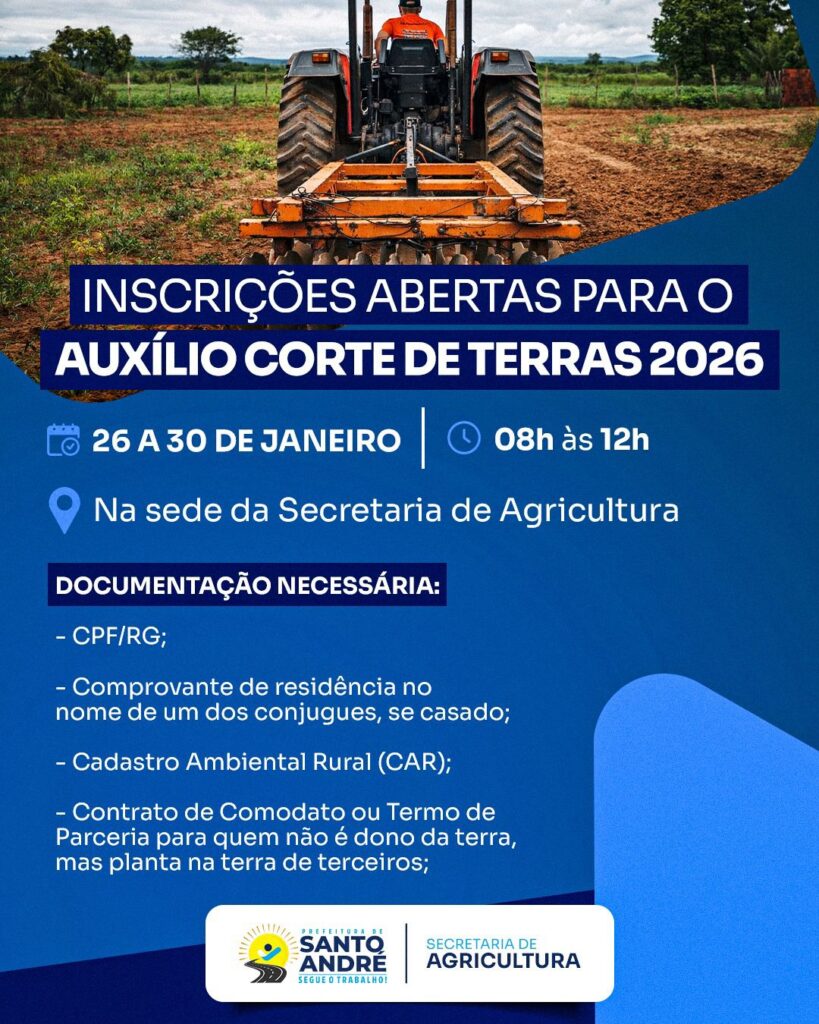 A Prefeitura de Santo André, por meio da Secretaria Municipal de Agricultura, abriu as inscrições para o Auxílio Corte de Terras 2026, que acontecem entre os dias 26 e 30 de janeiro, das 8h às 12h, na sede da Secretaria.