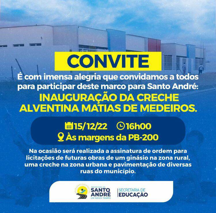 A solenidade de entrega da creche terá início às 16hs, e será realizada no respectivo local, na qual está localizado às margens da PB-200, zona urbana de Santo André.