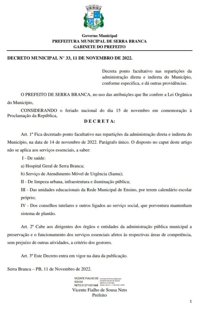Por causa do feriado da Proclamação da República, que cai na terça-feira (15), a Prefeitura de Municipal de Serra Branca decretou ponto facultativo para a segunda-feira (14). Com esse dia de folga, os servidores municipais terão quatro dias de descanso a partir do próximo fim de semana.