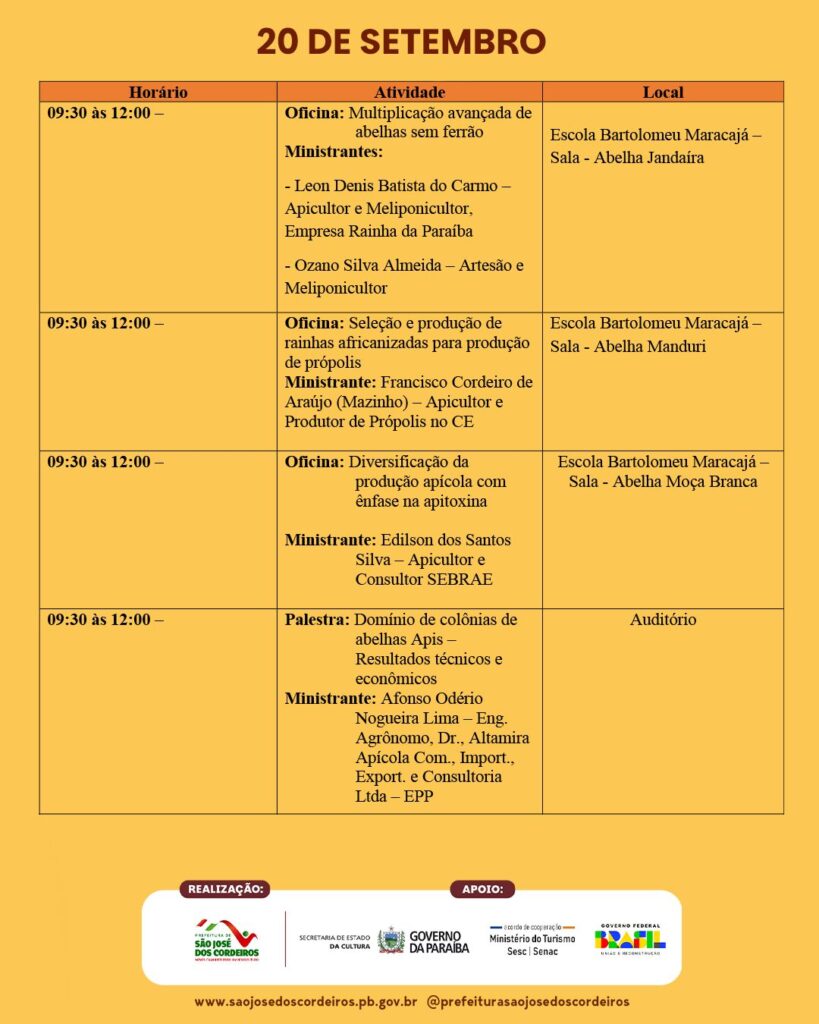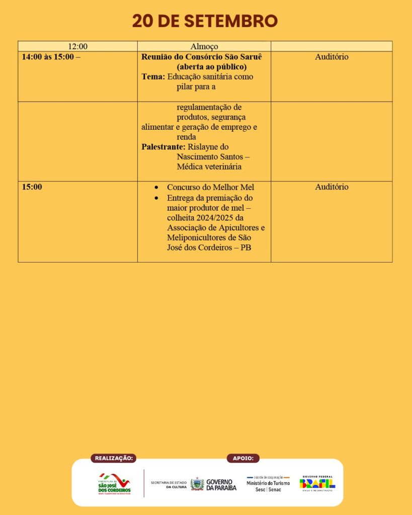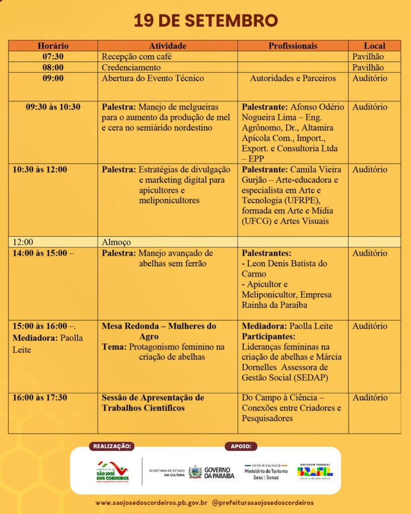 A Prefeitura de São José dos Cordeiros divulgou a programação técnica da XV edição do Festival do Mel, que será realizada nos dias 18, 19 e 20 de setembro de 2025, reafirmando o município como a Capital do Mel do Cariri Paraibano.