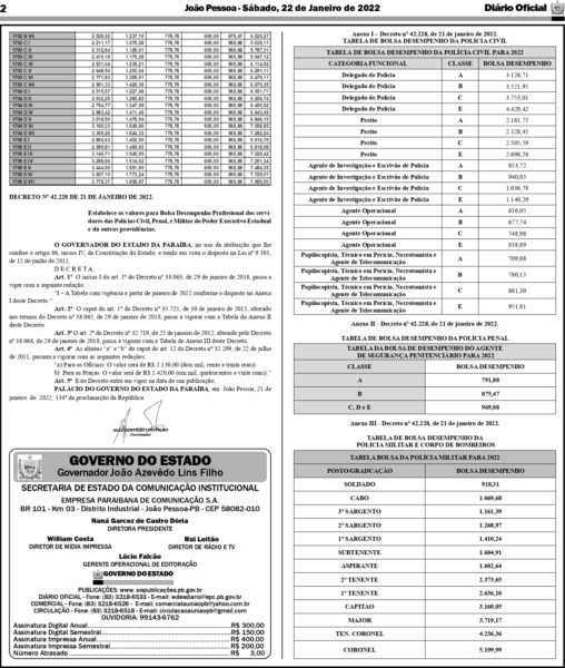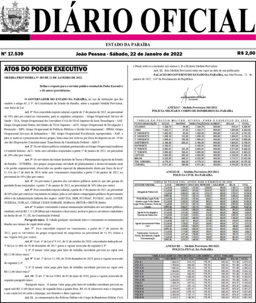 Foi publicada na edição deste sábado (22) do Diário Oficial do Estado (DOE), a Medida Provisória (MP) de nº 303 que define o reajuste para o servidor público estadual do Poder Executivo. O valor fica reajustado a partir de 1º de janeiro de 2022. O governador da Paraíba, João Azevêdo (Cidadania), já havia anunciado ontem (21) que estenderia o reajuste que concedeu aos policiais