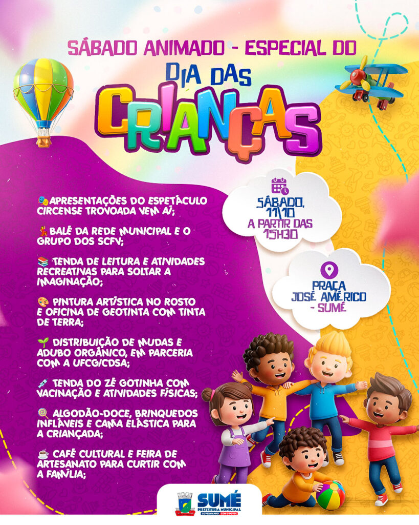 A Prefeitura de Sumé está preparando uma tarde inesquecível para celebrar o Dia das Crianças num evento gratuito e aberto ao público. No próximo sábado, 11 de outubro, a Praça José Américo será palco do Sábado Animado – Especial Dia das Crianças, a partir das 15h30. O evento reúne todas as secretarias municipais e parceiros em uma programação repleta de alegria, lazer, cultura, educação, saúde e sustentabilidade, pensada para encantar as crianças e suas famílias.