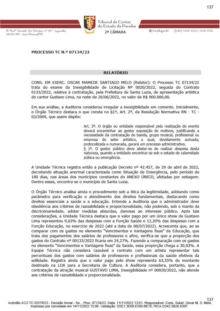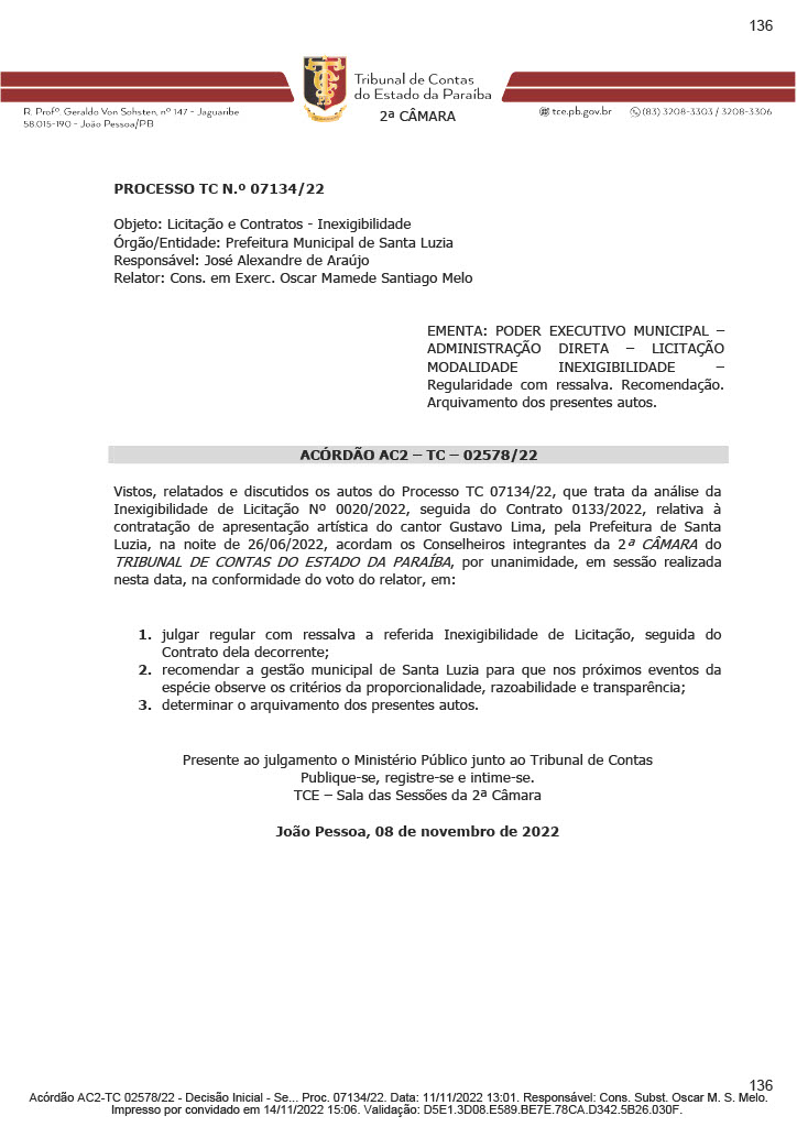 O Tribunal de Contas do Estado da Paraíba (TCE-PB) julgou regular a contratação do cantor Gusttavo Lima para show na cidade de Santa Luzia durante o São João de 2022 que custou R$ 900 mil para os cofres públicos. A decisão de arquivar o processo após considerar a licitação e a contratação regulares foi tomada em sessão na última terça-feira (08).