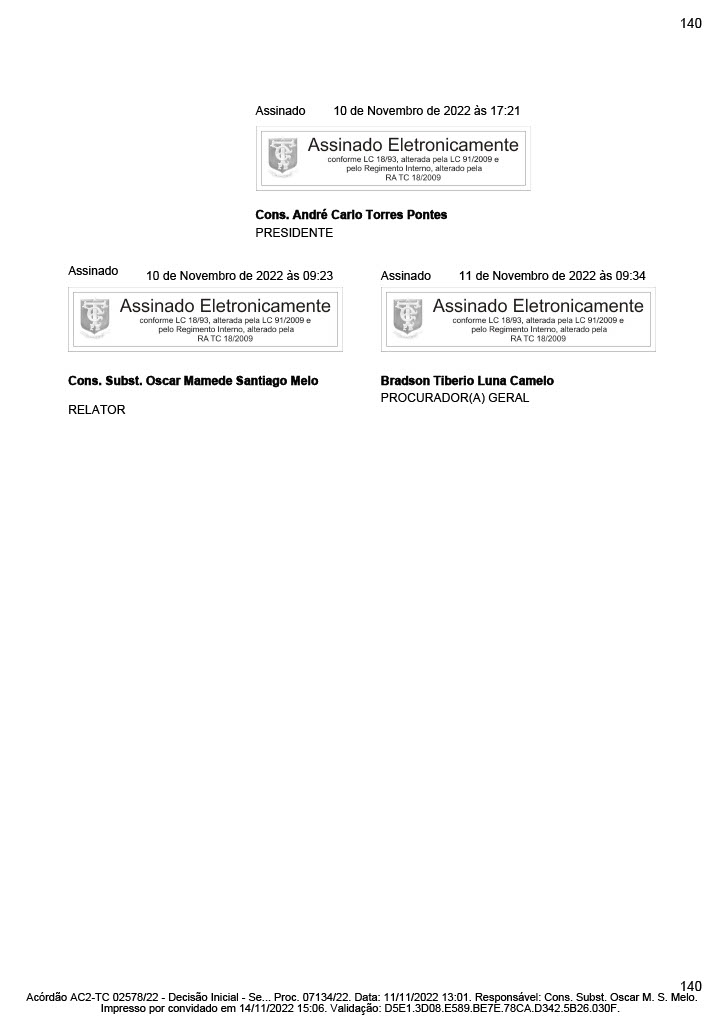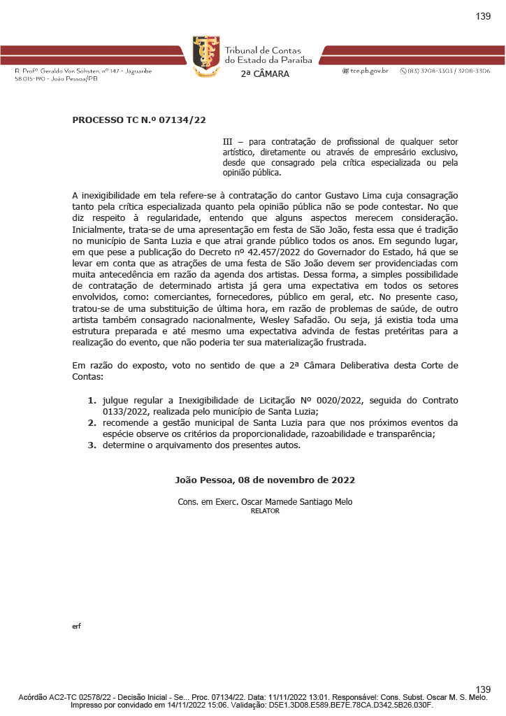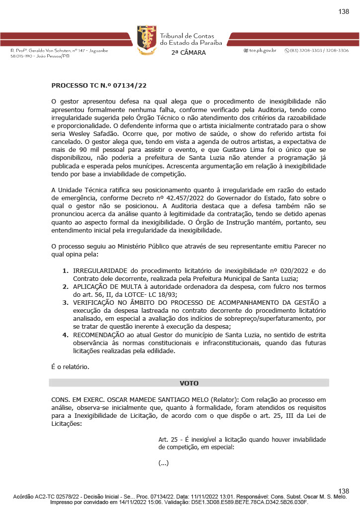 Em seu voto, o conselheiro Oscar Mamede considerou que a consagração do cantor Gusttavo Lima é incontestável e reflete na inexigibilidade da licitação. O relator ressaltou ainda que a contratação de Gusttavo Lima aconteceu devido a uma substituição de última hora devido a problemas de saúde de Wesley Safadão. “Ou seja, já existia toda uma estrutura preparada e até mesmo uma expectativa advinda de festas pretéritas para a realização do evento, que não poderia ter sua materialização frustrada”, destacou.