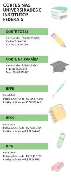 A Universidade Federal da Paraíba tinha uma dotação orçamentária autorizada de R$ 159.644.348 para este ano. Com a decisão do Governo, a instituição perderá 31,6% dos recursos, um total de R$ 50.383.446. A Universidade Federal de Campina Grande tem uma dotação de R$ 93.965.309 e a perda será de 31,5%, ou seja, num valor de R$ 29.644.610 0,5%. Já o Instituto Federal da Paraíba que detinha um orçamento de R$ 78.417.705 perderá R$ 23.343.081, um total de 29,8%.