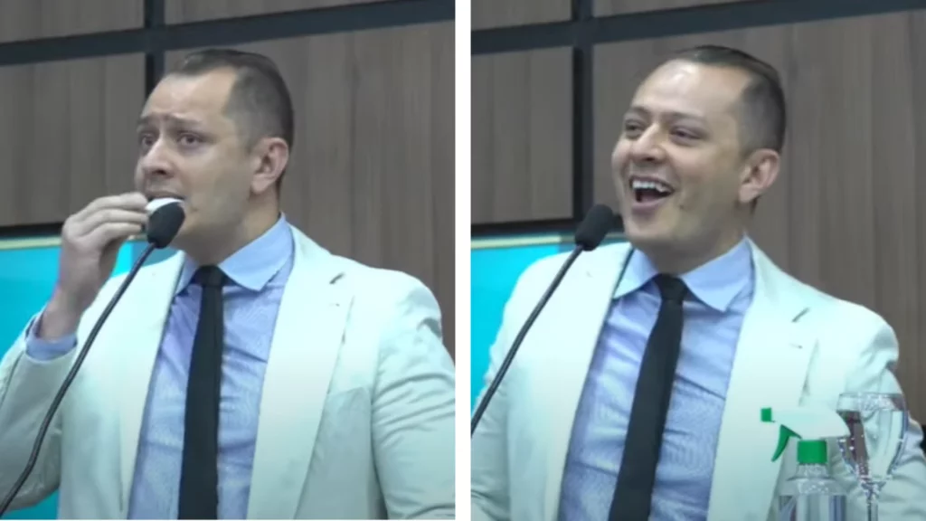 Em forma de protesto, contra os parlamentares que não estavam seguindo o regimento e nem a lei, o vereador começa a comer os papéis da lei organiza e diz: “O Regimento Interno e Lei Orgânica não serve de nada aqui, é melhor comer mesmo, pelo menos está servindo para alguma coisa, já que não está sendo seguida, é triste um negócio desse”.