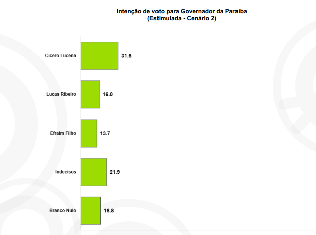 O vice-governador Lucas Ribeiro (PP) surge em segundo lugar, com 16,0%, seguido pelo senador Efraim Filho (União Brasil), que tem 13,7%. O levantamento mostra ainda que 21,9% dos entrevistados estão indecisos, enquanto 16,8% disseram que votariam em branco ou nulo.