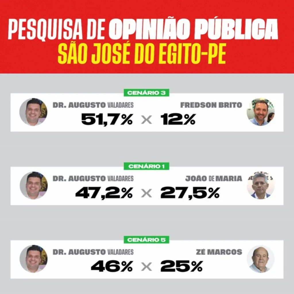 Em São José do Egito, cidade Pernambucana, vizinha a Ouro Velho, onde tem o nome ventilado para ser candidato, lidera em todos os cenários, conforme mostra o levantamento do Instituto Opinião, onde venceria seus adversários, como o ex-prefeito Zé Marcos, o vereador, João de Maria, e Fredson Brito.