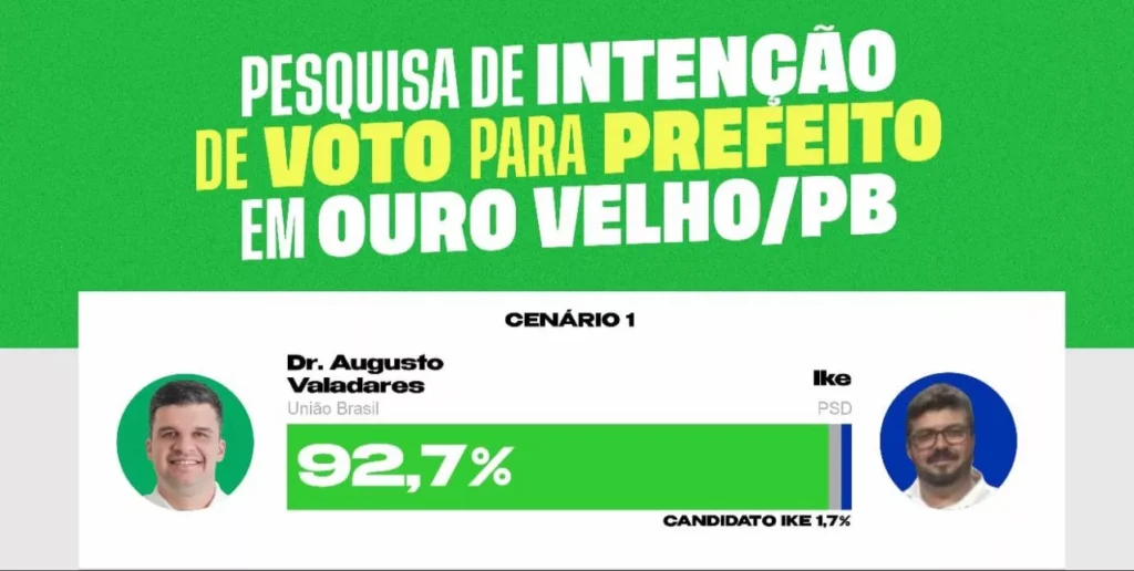 Em Ouro Velho, cidade que ele é prefeito, lidera com 92,7% sem dar chance alguma à oposição, onde venceria com folga as eleições de 2024 contra seu suposto adversário, o fisioterapeuta Ike (PSD) que possui apenas 1,7% dos votos.