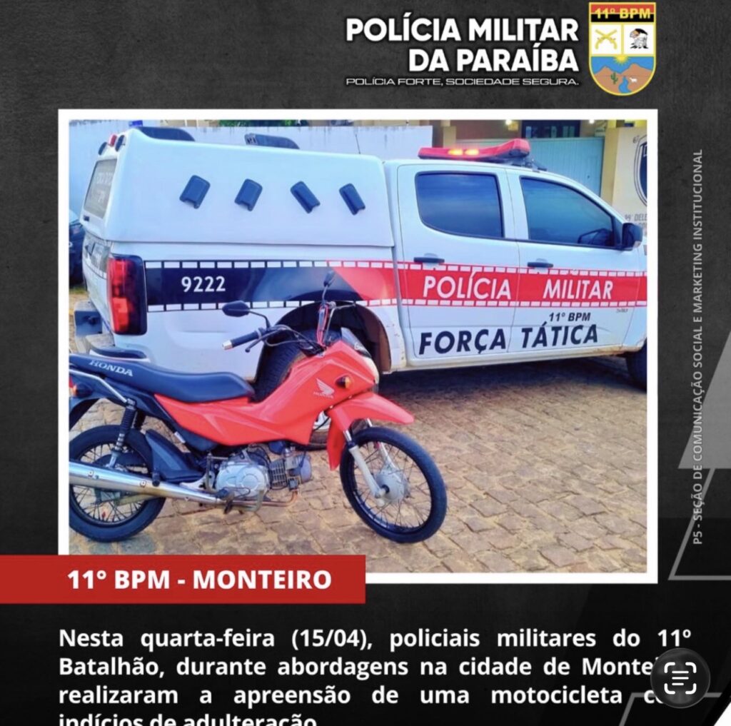 Uma ação da Polícia Militar resultou na apreensão de uma motocicleta com indícios de adulteração veicular, nesta quarta-feira (15), no município de Monteiro, no Cariri paraibano.