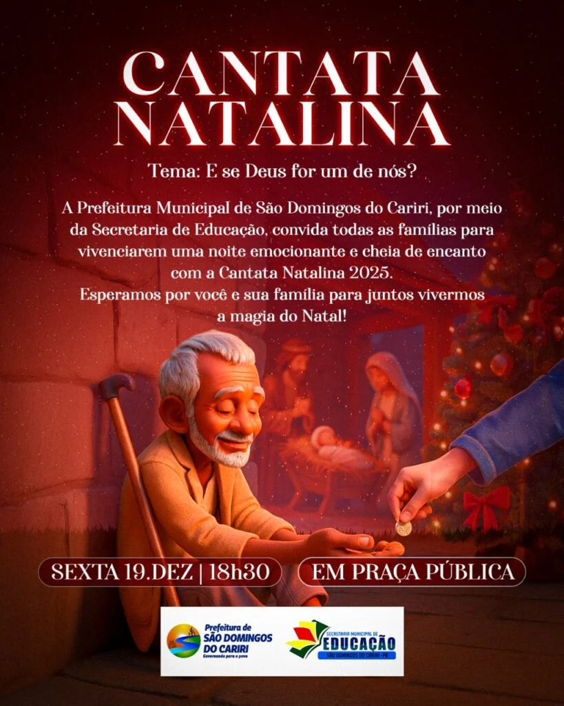A Prefeitura Municipal de São Domingos do Cariri, por meio da Secretaria Municipal de Educação, anuncia a realização da Cantata Natalina 2025, que acontecerá no próximo dia 19 de dezembro. O evento trará como tema “E se Deus fosse um de nós”, convidando a comunidade a uma profunda reflexão sobre o verdadeiro significado do Natal.