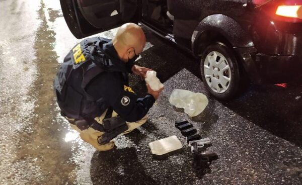 Após a equipe encontrar as armas, questionou ao casal se havia mais algum ilícito no carro. O condutor, um homem de 33 anos, informou aos policiais que havia droga escondida na lataria do veículo. Após busca, foram encontrados 1,76 kg de cocaína em pedaços embalados em um plástico.