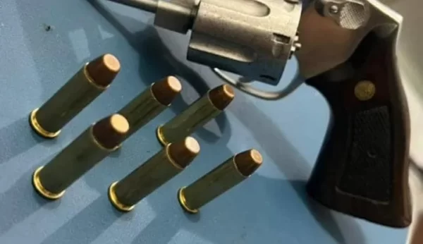 A arma, um Revólver Cal 38, foi localizada no interior da residência da vítima e agressor, onde a mesma que indicou o local.