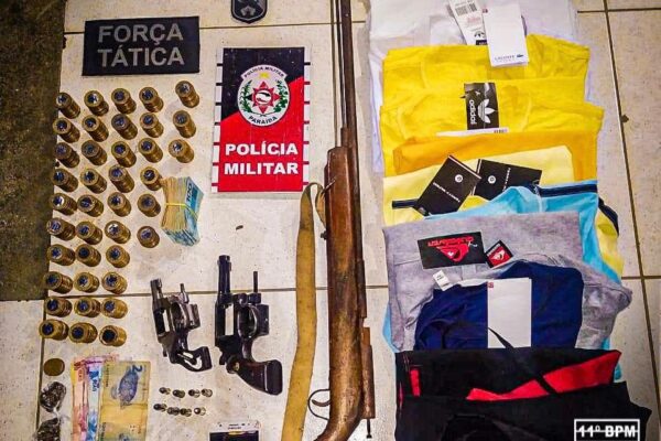 Ainda durante buscas, a PM chegou na casa do comparsa do suspeito e apreendeu uma espingarda e um revólver calibre 38. O homem fugiu antes da PM chegar. Já as roupas roubadas haviam sido vendidas, mas foram localizadas e apreendidas. Ao todo, 15 peças foram recuperadas.