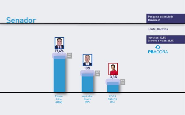 No cenário 2, Efraim Filho (DEM) lidera com 17,6% contra 10% de Aguinaldo Ribeiro (PP) e 3,3% de Bruno Roberto (PL). Indecisos: 42,5%; Branco ou nulo: 26,6%.