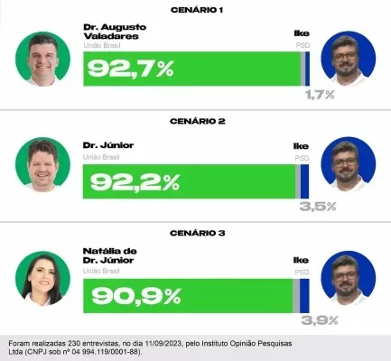 Em outro possível cenário o médico Dr. Júnior (União Brasil) venceria a disputa com 92.2% dos votos contra 3,5% do candidato oposicionista Ike (PSD). Caso a candidata seja a ex-prefeita Natália de Dr. Júnior (União Brasil) a vitória seria de 90,9 % dos votos contra 3,9% de Ike (PSD).