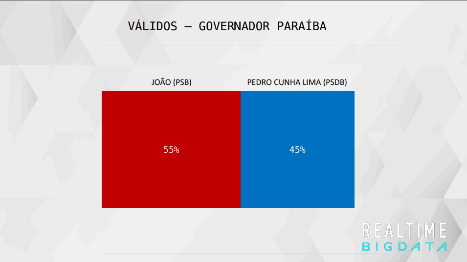 A pesquisa Real Time Big Data, contratada pela Record TV foi divulgada nesta terça-feira (11) e mostra que a disputa pelo governo da Paraíba tem o atual governador, João Azevedo (PSB), liderando as intenções de voto contra Pedro Cunha Lima (PSDB). Nos votos válidos, João Azevêdo tem 55% contra 45% de Pedro Cunha Lima.